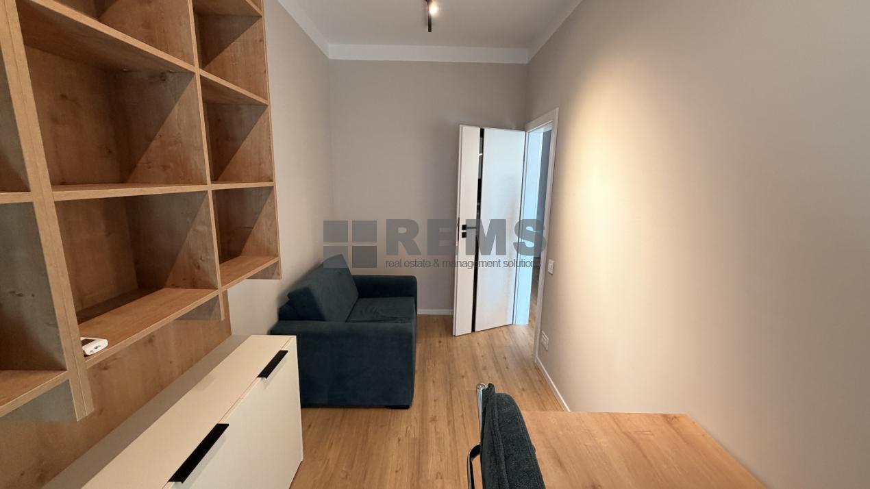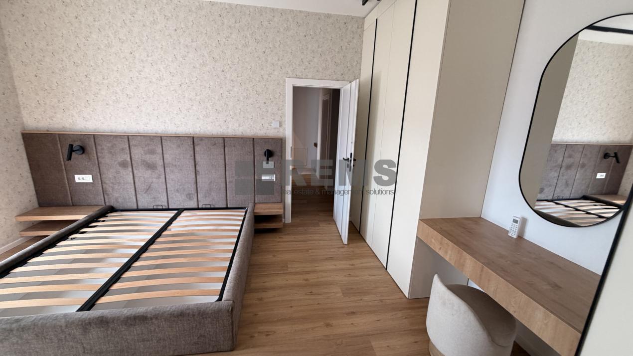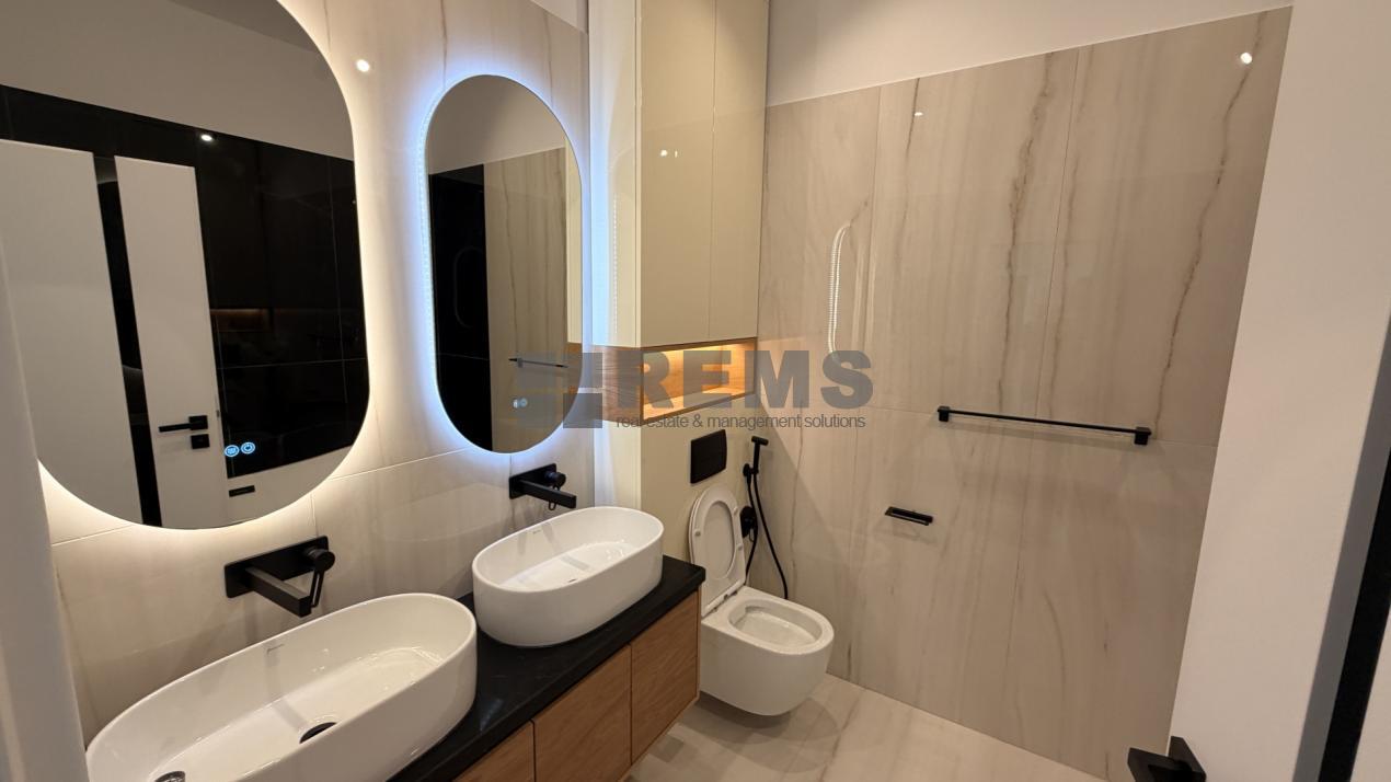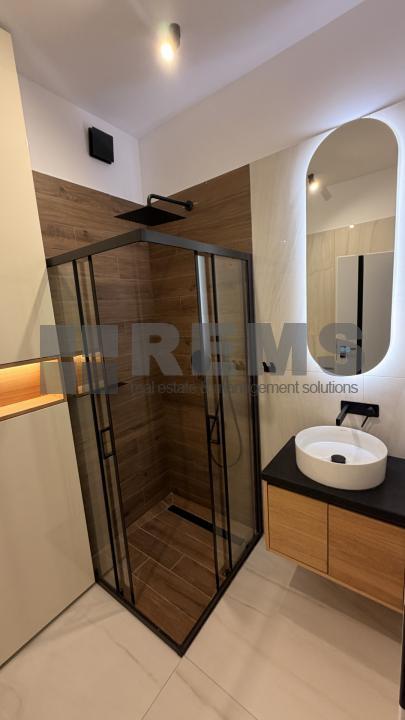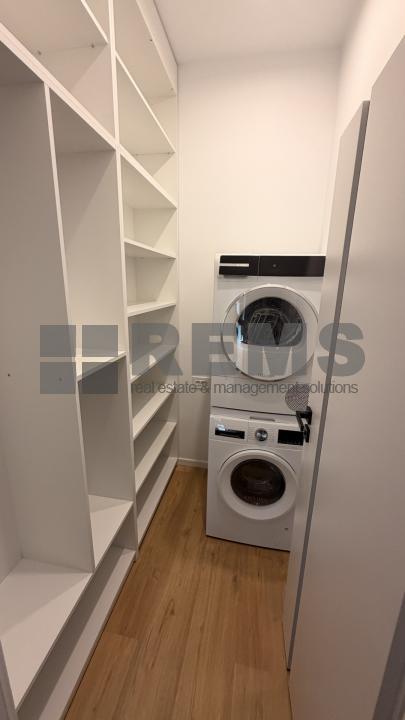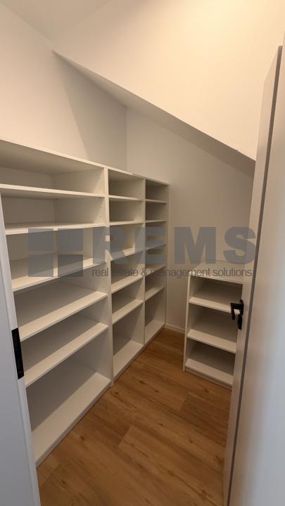 La etaj se afla zona de noapte, compusa dintr-un hol generos, un al doilea birou si doua dormitoare. Dormitorul matrimonial dispune de zona proprie de dressing si baie privata, echipata cu cada, iar cea de-a doua camera, luminoasa si bine proportionata, poate fi folosita ca dormitor pentru copil sau oaspeti. In total, apartamentul beneficiaza de 3 bai, oferind un plus de confort. Ambele dormitoare au acces direct catre terasa amenajata cu pardoseala flotanta, ideala pentru momente de relaxare.