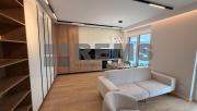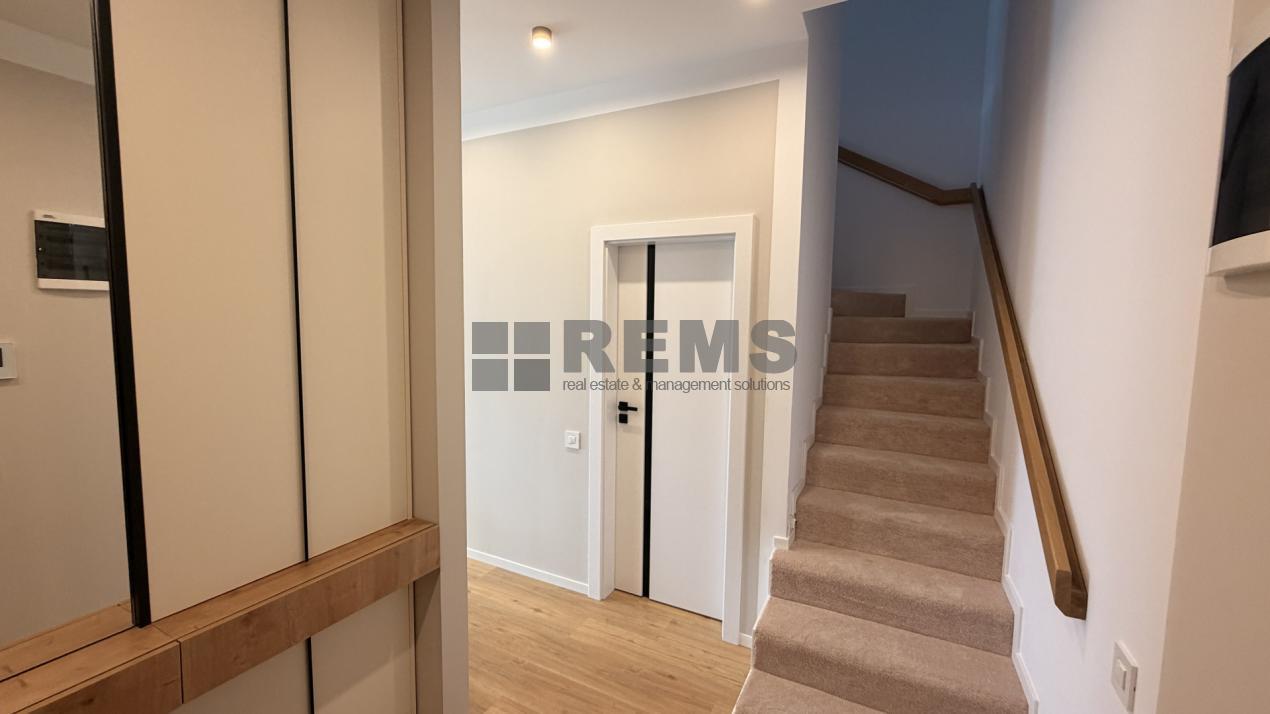 Compartimentarea este gandita pentru confort si functionalitate. La primul nivel regasim un hol de acces generos, prevazut cu dressing, o baie si scara interioara. Zona de zi este aerisita si luminoasa, cu un living amenajat modern, ce include canapea si fotoliu confortabil, ideal pentru relaxare. Bucataria este complet utilata si integrata armonios in spatiu, fiind completata de o zona de bar/insula potrivita pentru 4 persoane. Pe acelasi nivel se afla si un birou dedicat, perfect pentru activitati profesionale sau studiu. Mobilierul este realizat la comanda, optimizat pentru fiecare spatiu.